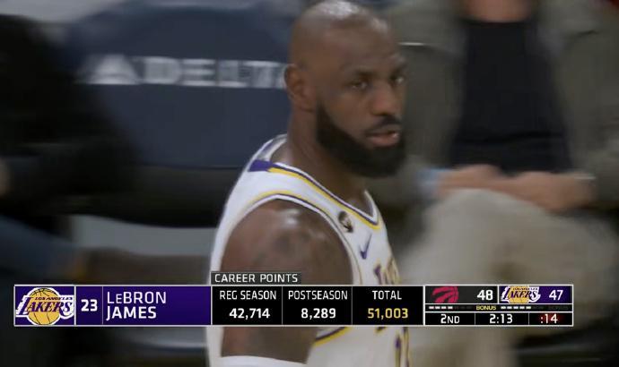 詹姆斯在对决猛龙的比赛之前,他NBA生涯常规赛与季后赛总得分,已经达到50992分。伴随詹姆斯如今上半场已经得到13分,他成功解锁NBA生涯常规赛51000分里程碑大关。